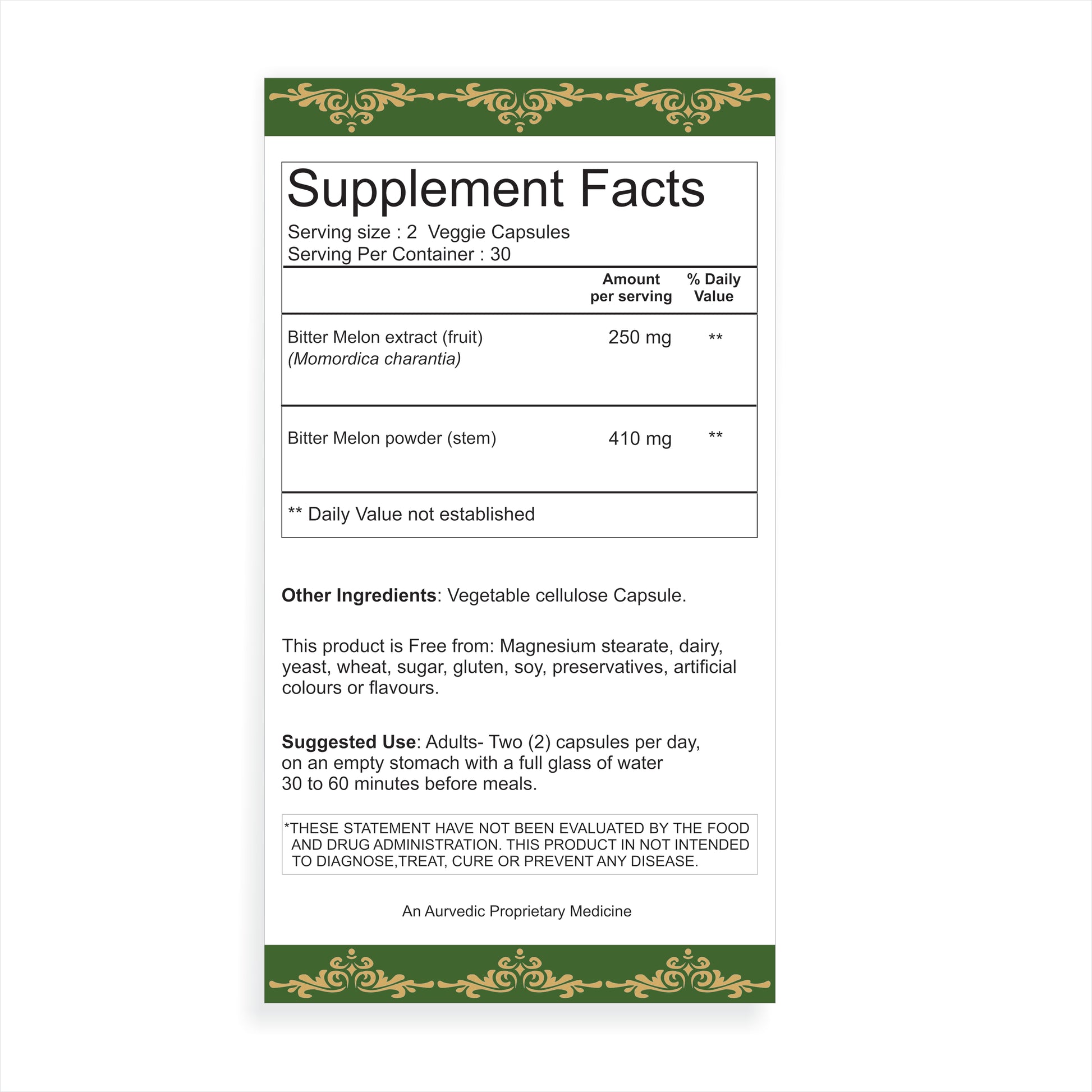 - Bitter Melon powder (Stem) - 410 mg per two (2) capsules