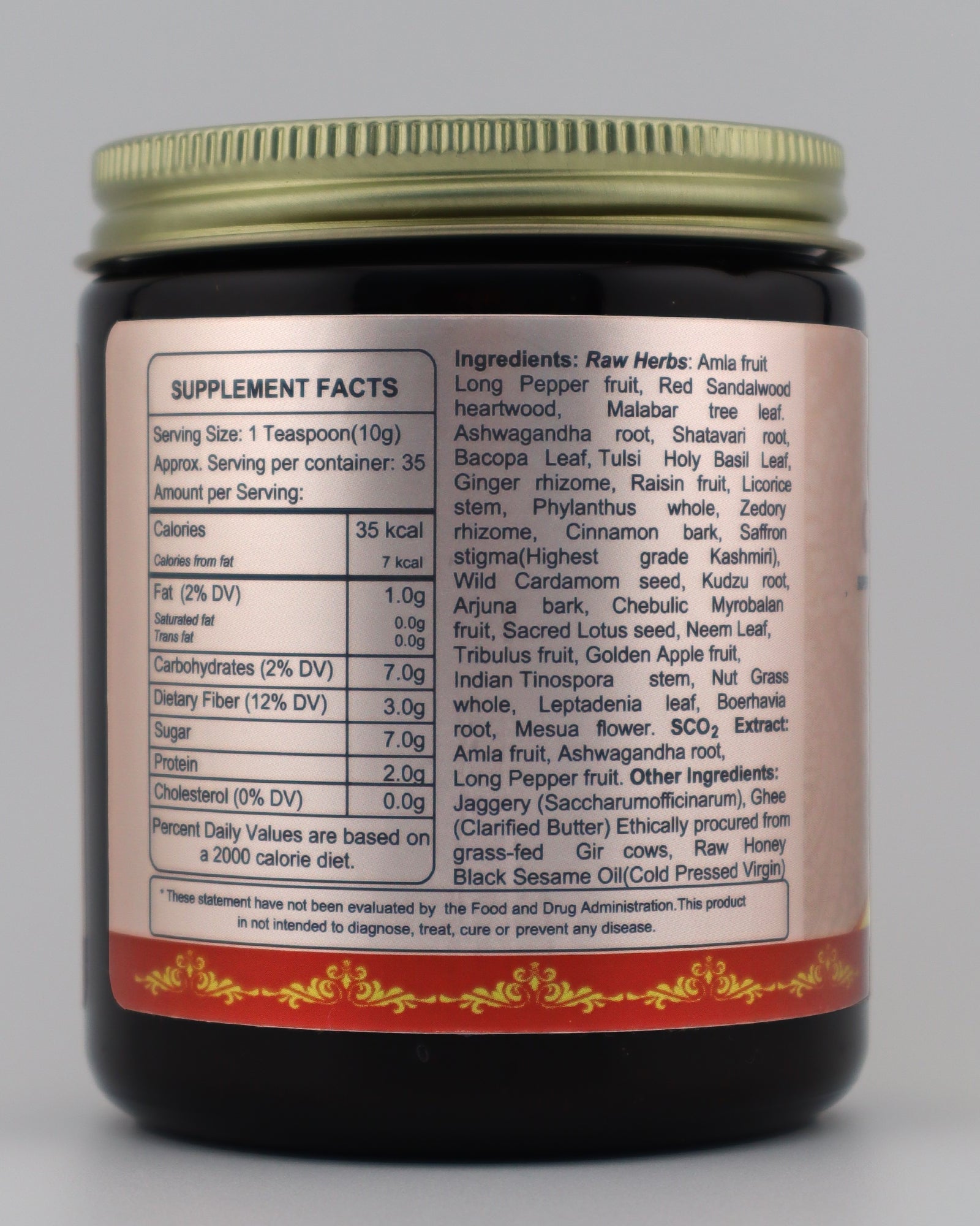 Raw Herbs: Amala fruit Long Pepper fruit, Red Sandalwood heartwood, Malabar tree leaf, Ashwagandha root, Shatavari root, Bacopa Leaf, Tulsi Holy Basil Leaf, Ginger rhizome, Raisin fruit, Licorice stem, Phylanthus whole, Zedory rhizome, Cinnamon bark, Saffron stigma (Highest grade Kashmiri), Wild Cardamom seed, Kudzu root, Arjuna bark, Chebulic Myrobalan fruit, Sacred Lotus seed, Neem Leaf, Tribulus fruit, Golden Apple fruit, Indian Tinospora stem, Nut Grass whole Leptadenia leaf, Boerhavia root, Mesua flower.