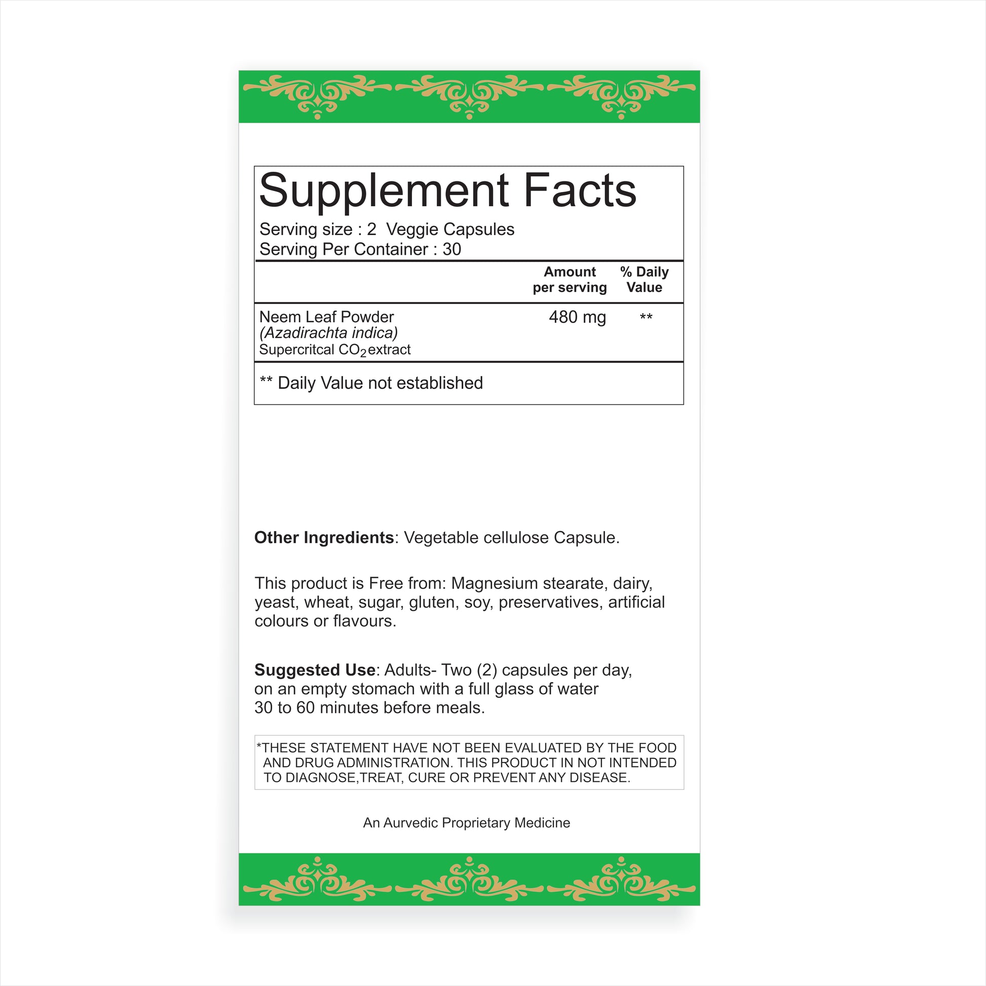 - Neem Leaf Powder (Azadirachta indica) - 480 mg per two (2) capsules