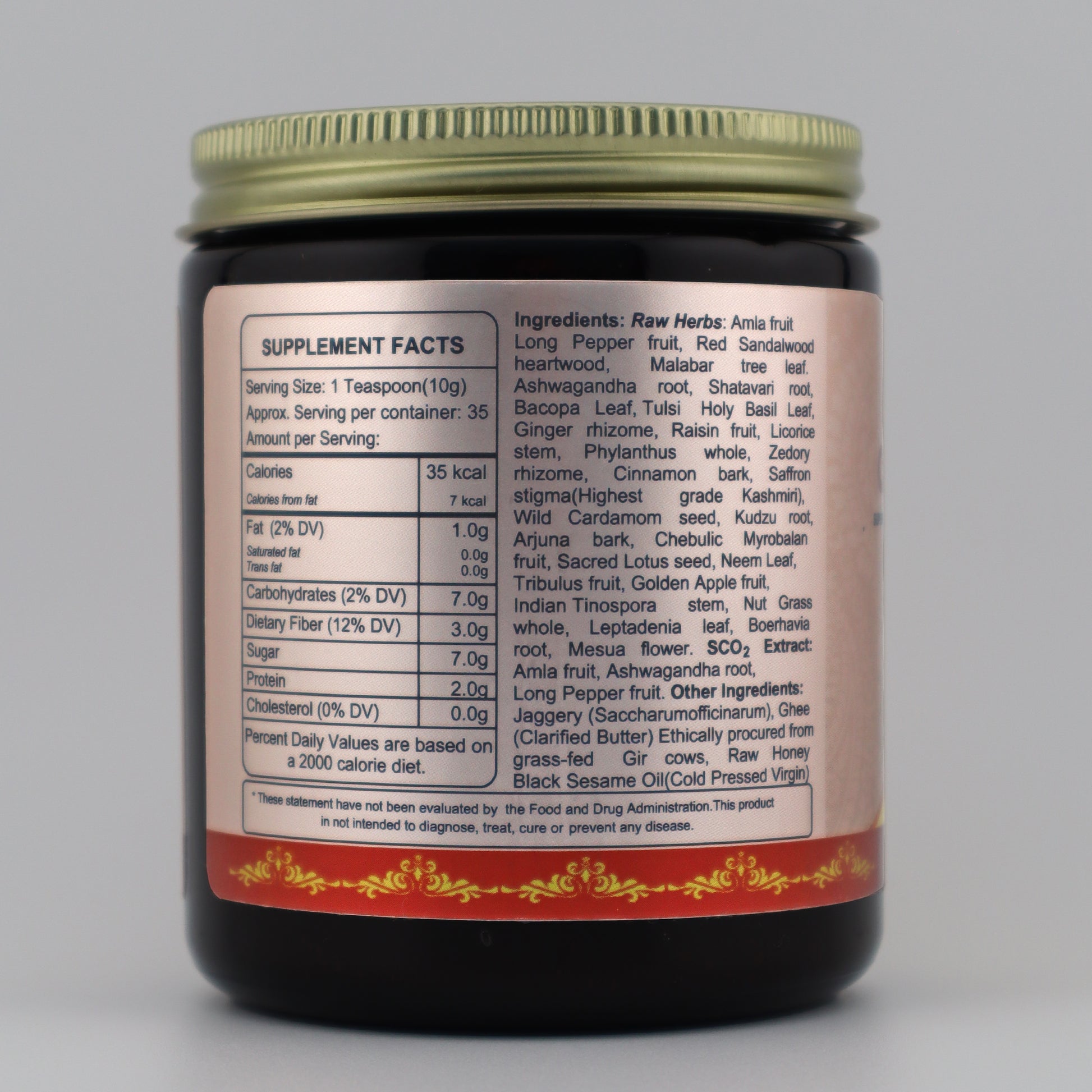 - Raw Herbs: Amala fruit, Long Pepper fruit, Red Sandalwood heartwood, Malabar tree leaf, Ashwagandha root, Shatavari root, Bacopa Leaf, Tulsi Holy Basil Leaf, Ginger rhizome, Raisin fruit, Licorice stem, Phylanthus whole, Zedory rhizome, Cinnamon bark, Saffron stigma (Highest grade Kashmiri), Wild Cardamom seed, Kudzu root, Arjuna bark, Chebulic Myrobalan fruit, Sacred Lotus seed, Neem Leaf, Tribulus fruit, Golden Apple fruit, Indian Tinospora stem, Nut Grass whole Leptadenia leaf, Boerhavia root, Mesua flower.